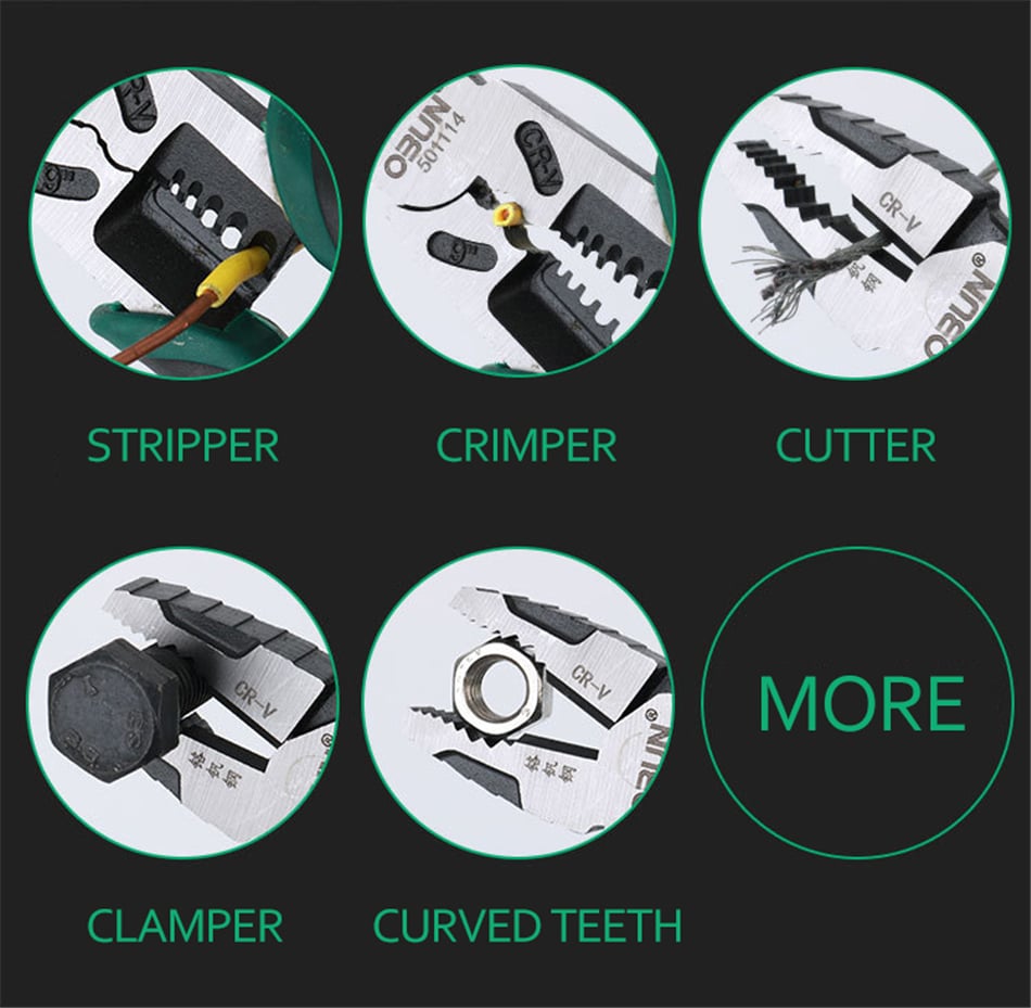 - The tool is made of high-grade steel with an enameled surface for strong clamping force and high hardness.Multi purpose for stripping,clamping,cutting,crimping and more!